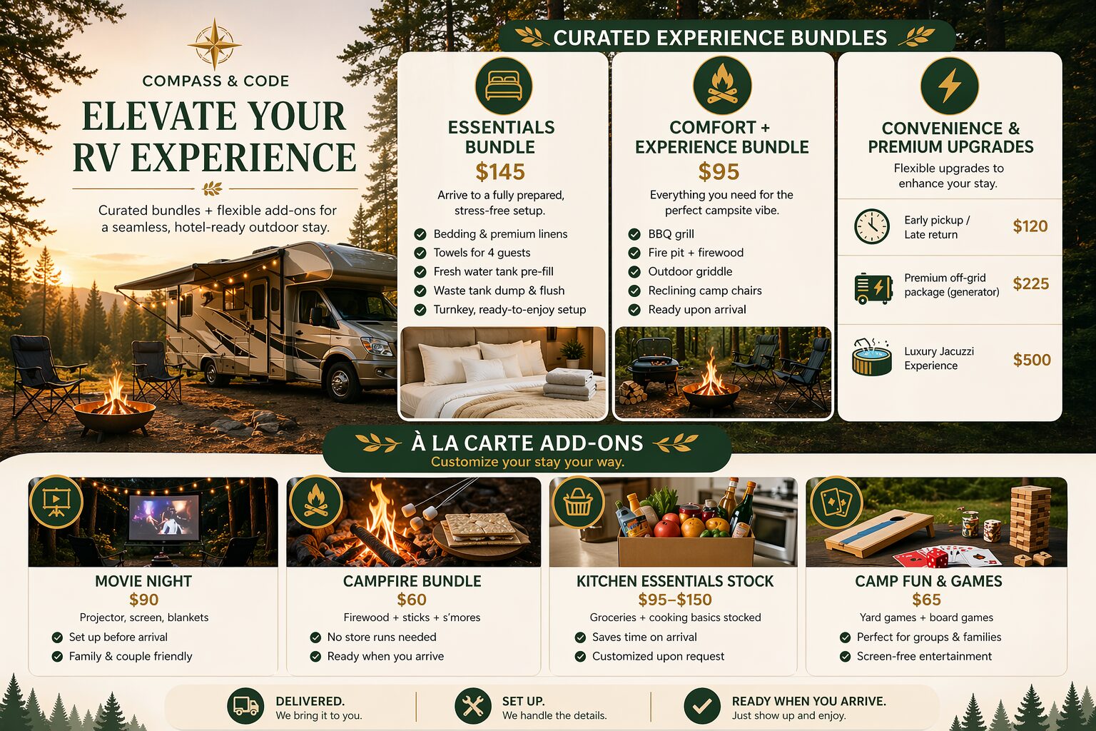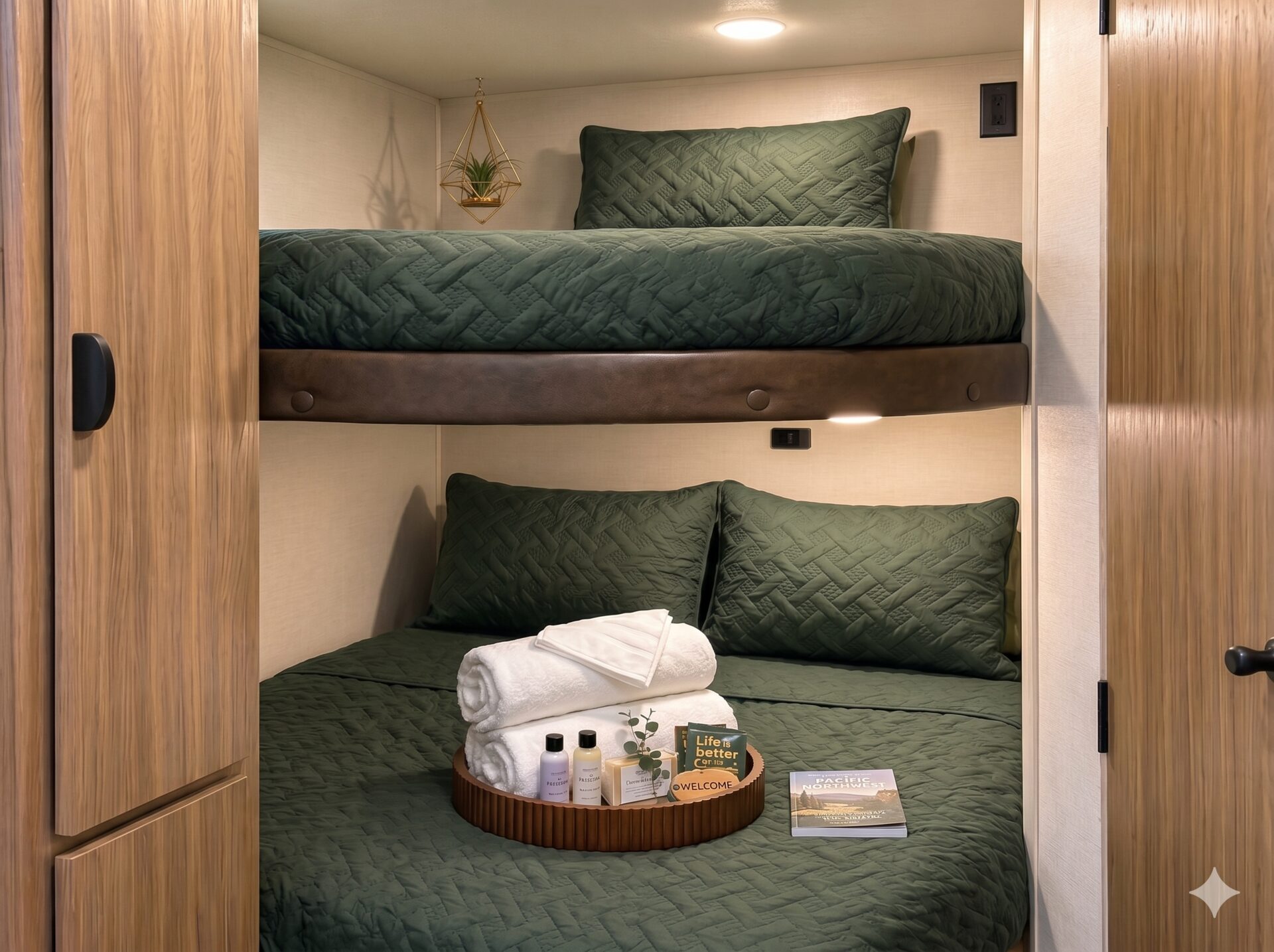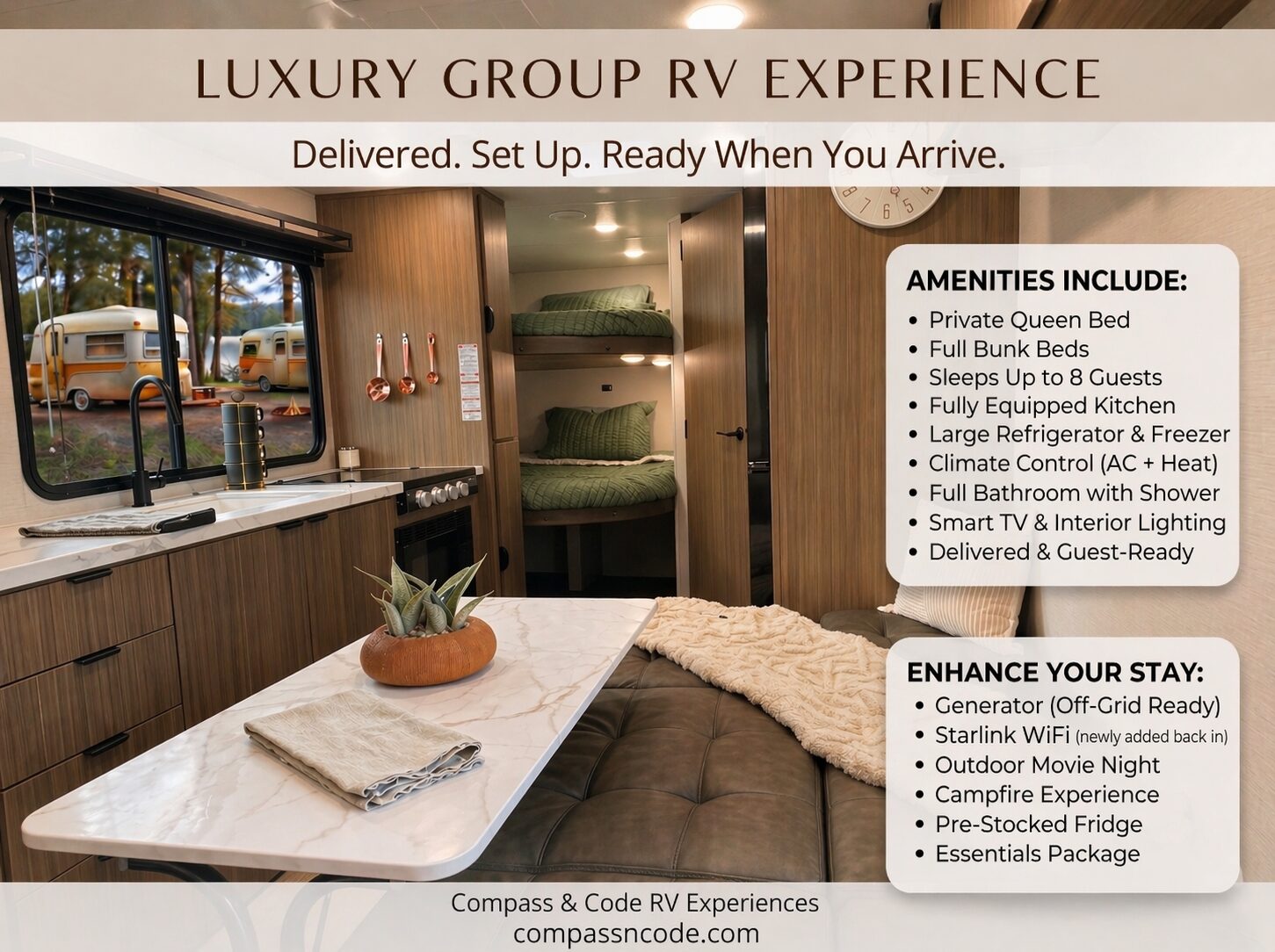 The Haven is built for families and groups who want the feel of home on the road, without the work. We deliver, level, and set up before you arrive. No towing. No setup. No guesswork. Just show up.