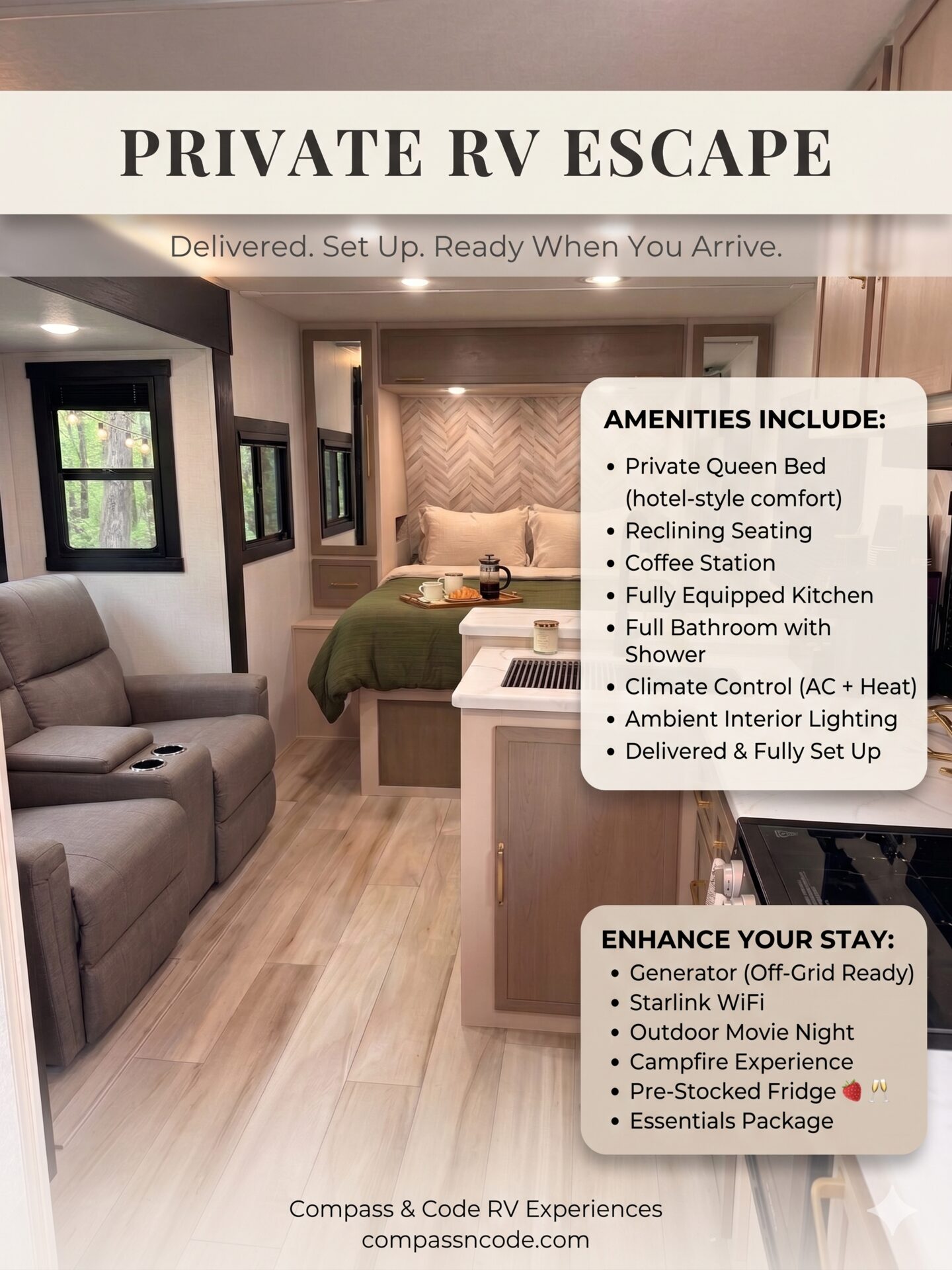 The Nest is designed for connection. Modern, intimate, quiet. We deliver and set everything up before you arrive, so the only thing left to do is settle in. No towing. No setup. Just your own retreat, ready when you are.